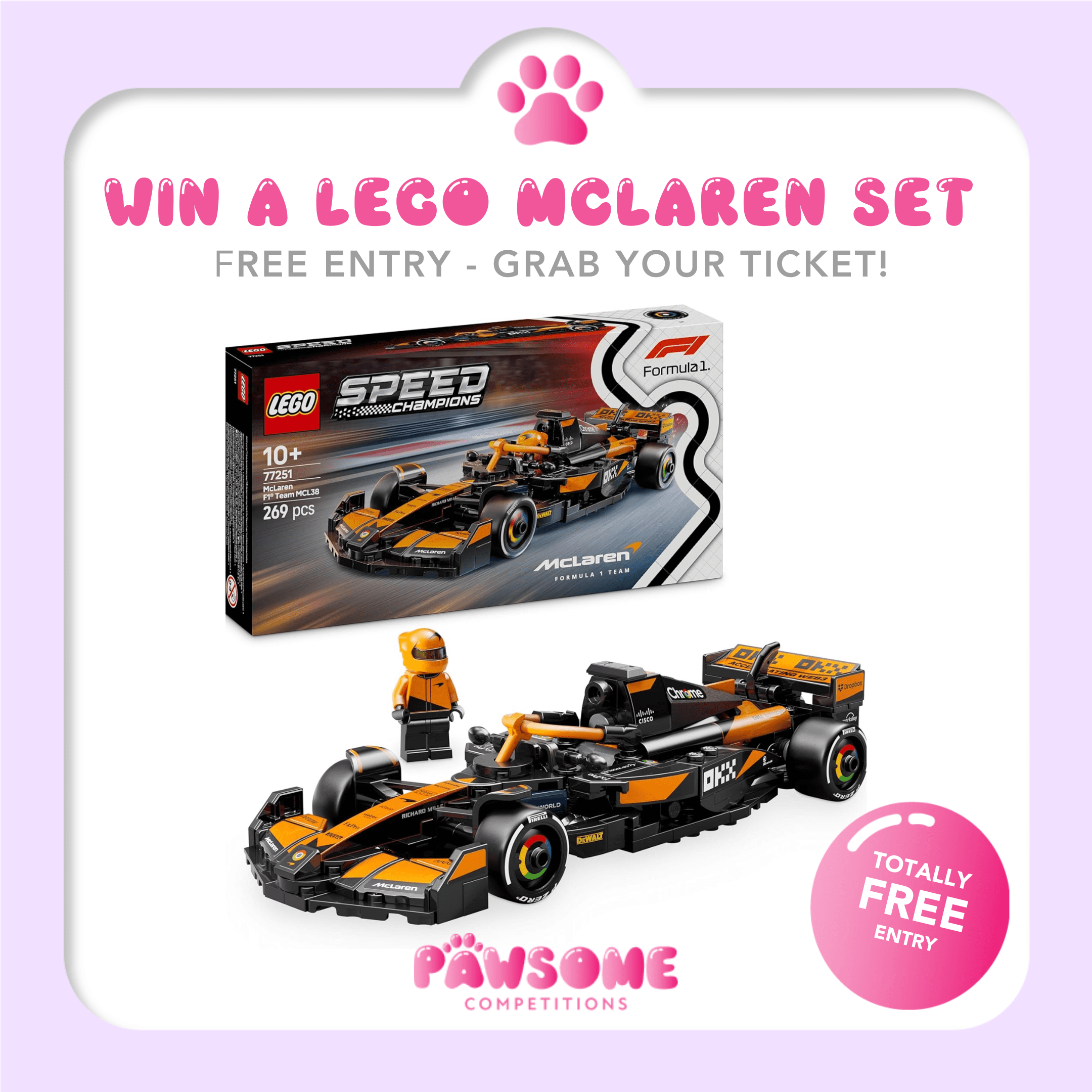 It’s time to build something epic, for free! Enter now to win the LEGO Speed Champions McLaren Formula 1 Race Car Set, complete with driver minifigure and authentic team detailing. Perfect for LEGO lovers, F1 fans, or anyone who loves a freebie! 🧱✨